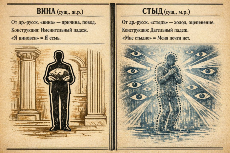 В современной психологии различение вины и стыда является общепризнанным. Исследования показывают, что вина связана с негативной оценкой конкретного поступка «я сделал плохо», тогда как стыд с негативной оценкой всей личности «я плохой». Семантический и экзистенциальный анализ этих конструкций показывает, что язык не просто описывает переживания, но формирует саму их структуру.