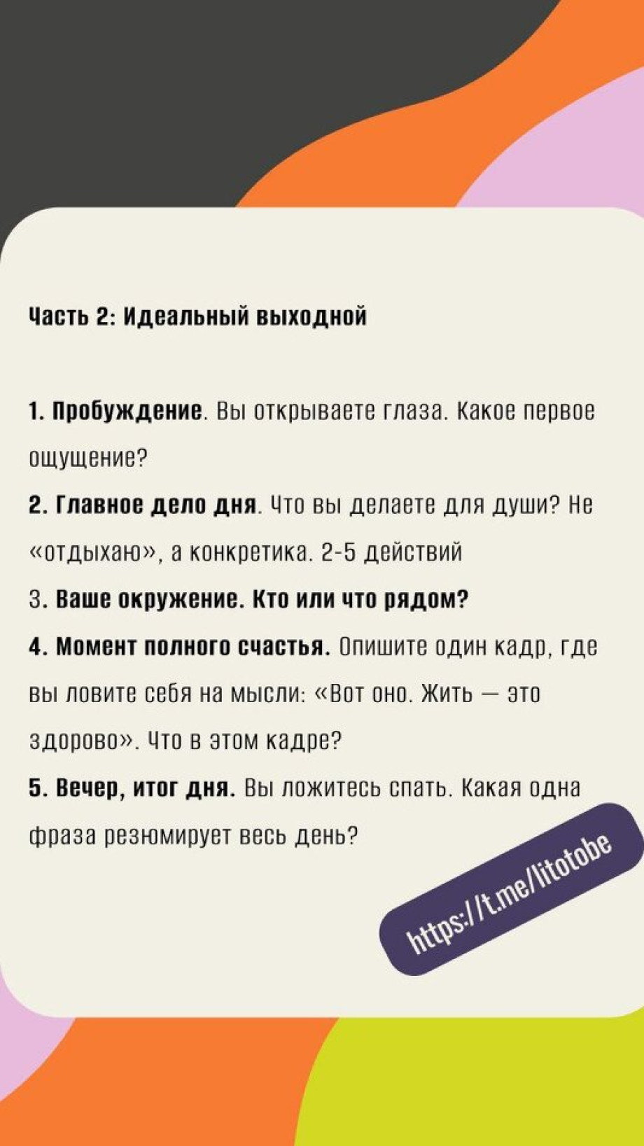 2. Главное дело дня. Что вы делаете для души? Не «отдыхаю», а конкретика. 2-5 действий