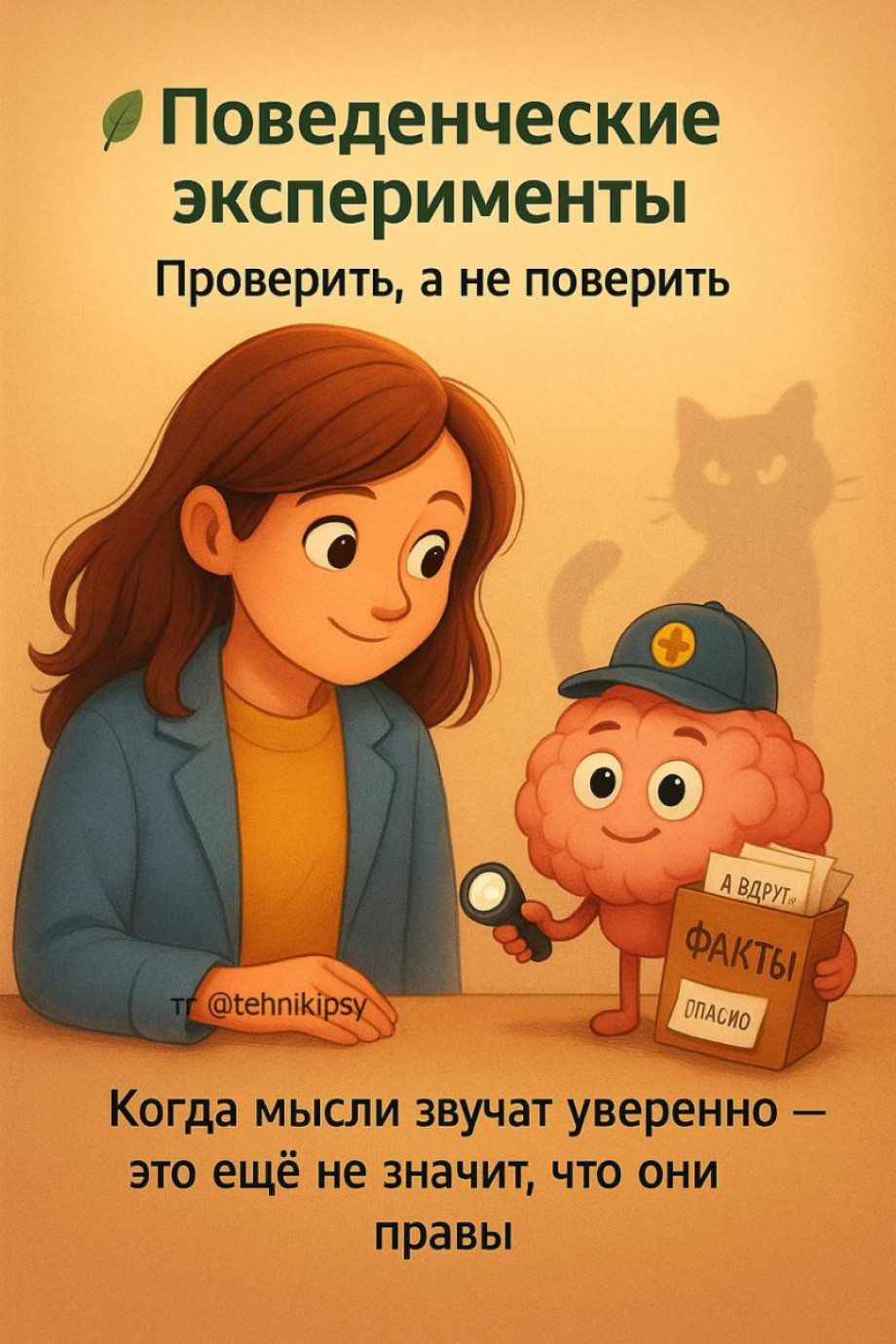 Но в когнитивно-поведенческом подходе мы делаем очень важный, почти освобождающий поворот: мы не спорим с этим сторожем, не пытаемся заткнуть ему рот и не доказываем, что он «неправильный». Мы признаём: ты стараешься защитить, — и вместо бесконечных внутренних переговоров выбираем другой путь — путь проверки.