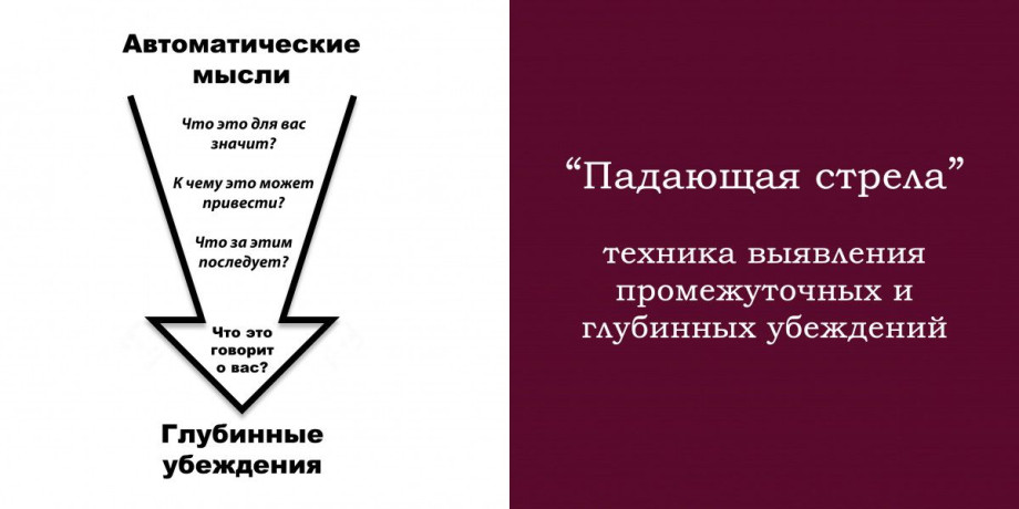 Для начала необходимо определить, какое именно убеждение находится в основе автоматических негативных мыслей клиента. Для этого подходят две техники: 1. Техника «Подающая стрела» и 2. «Журнал мыслей».