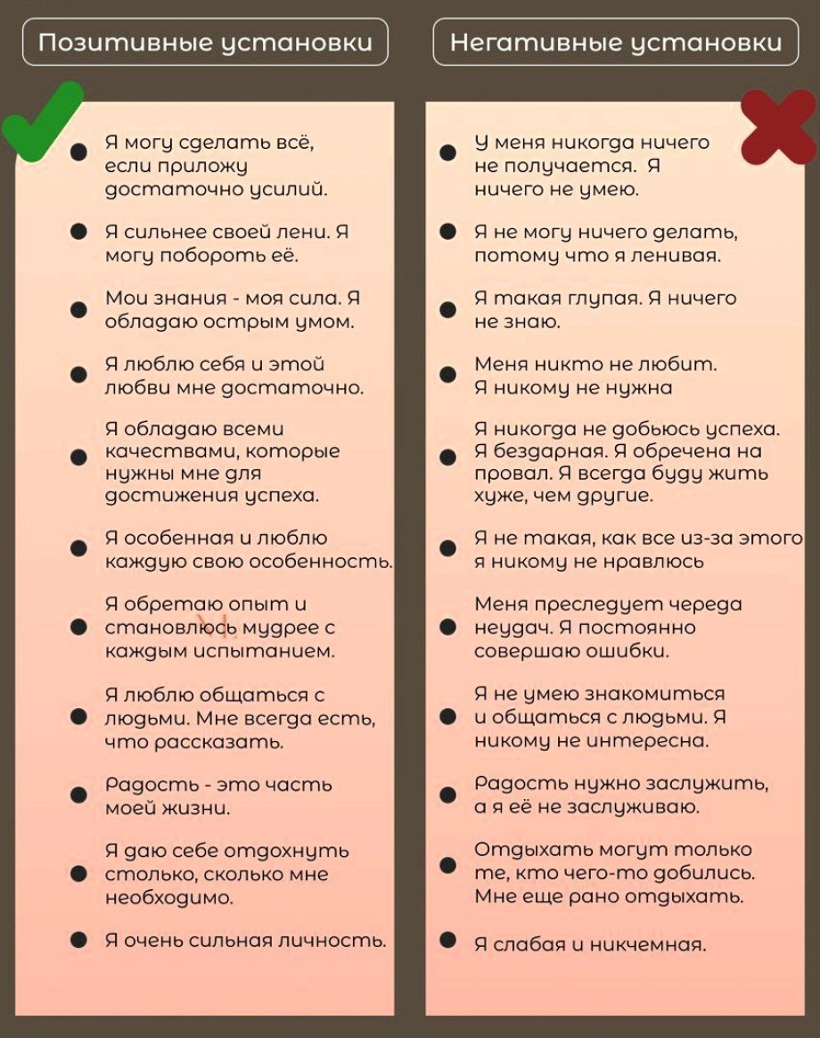 Списки негативных и альтернативных им, позитивных установок для удобства работы с ними.