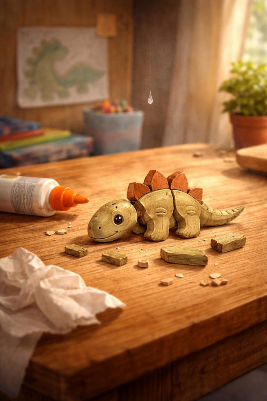 Сын расстроился. Но мы нашли все кусочки, и я поняла, что могу его склеить. Что-то плохое случилось, но это можно исправить. Я собрала все части, положила их на столик, в ожидании подходящего момента. То клей не находился, то время, то гости... Сегодня настал момент, я пошла за динозавриком – а его нет. Столик двигали, мои вещи переложили на другой стол, а динозавр исчез. Я обыскала всё. Похоже, в суете гостей кто-то решил, что это просто мусор, и выбросил.